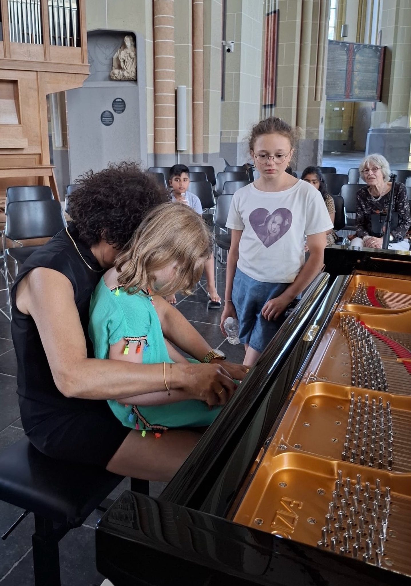 Op de foto zie je hoe zij aandachtig kijkt naar haar zusje, die met verwondering de toetsen van de Fazioli vleugel aanraakt en voelt.